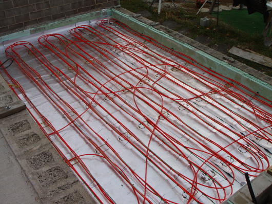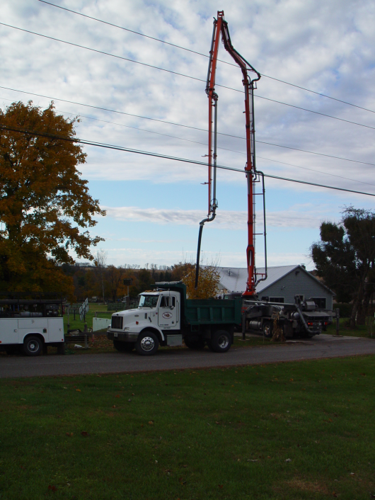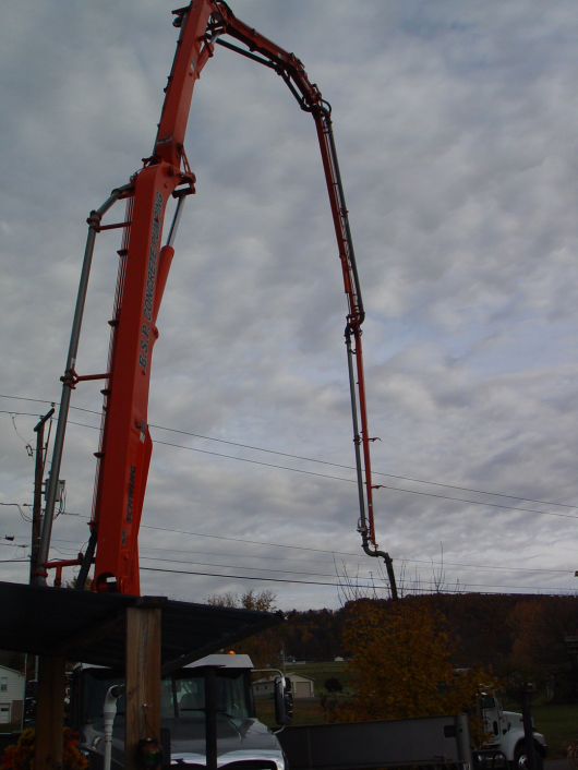 Here are pictures of my concrete floor fill with the PEX floors for passive solar and active boost (If desired) for my new expansion. I was expecting the pump rig to be a "hand unit" with a hose over the wall with 2 guys on it, type of thing, etc.. When I came out the side door and looked up, I just about $hit! The instantanous creative impulse and accomping picture (Later) I called the "steel rainbow". ~50' up!